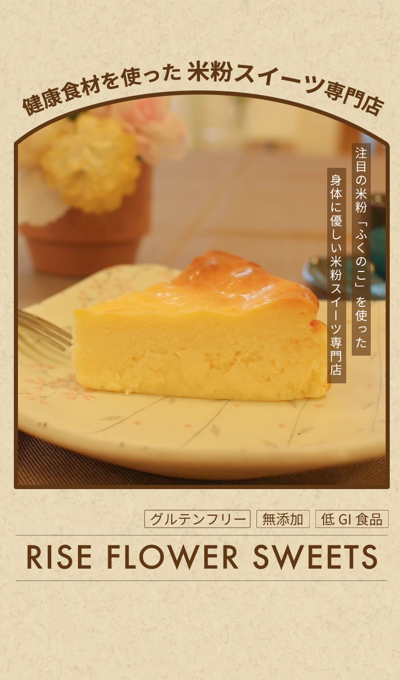 濃厚でなめらかな口どけがたまらない、特製の米粉チーズケーキ。グルテンフリーで、アレルギーをお持ちの方にもお楽しみいただけます。